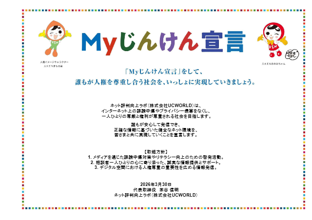 ネット評判向上ラボ(株式会社UCWORLD)は、法務省が推進する「My じんけん宣言」の趣旨に賛同し、以下の通り「My じんけん宣言」を策定いたしました。