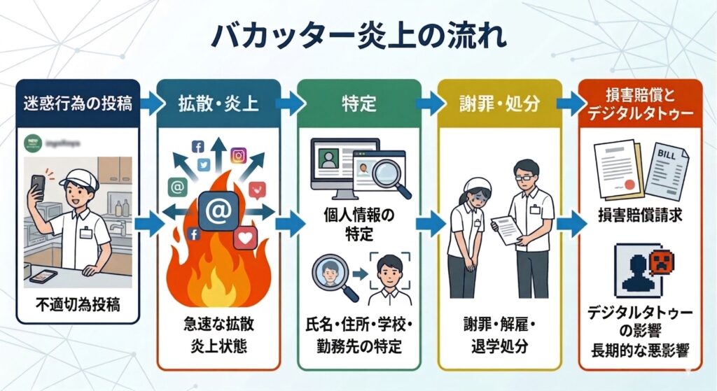 一度インターネットの海に火が放たれると、その後の結末は個人の特定、高額な賠償請求、そして消えないデジタルタトゥーといった悲惨な末路につながります。