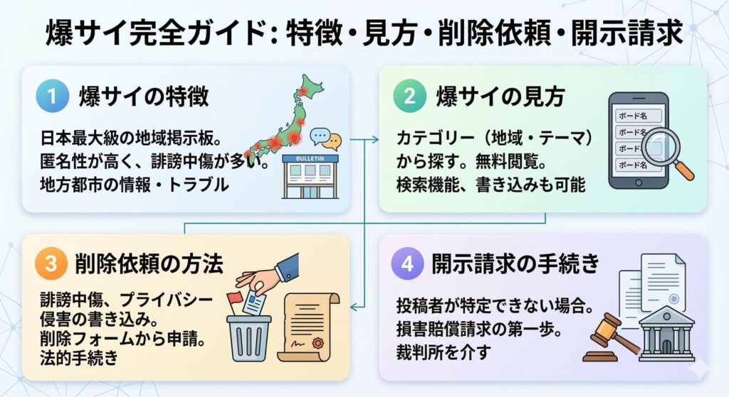 この記事では、爆サイの基本的な使い方から、悪質な書き込みへの対処法である削除依頼や投稿者を特定する発信者情報開示請求まで、具体的な手順を解説します。