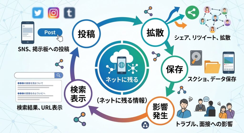 元の投稿を削除したとしても、複製されたデータがネット上に残り続けるため、完全な消去は極めて困難です。