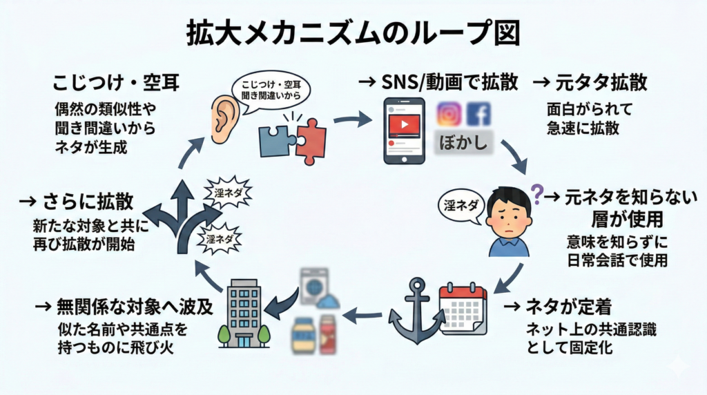 ここでは、被害が広がり続けるメカニズムを「こじつけ文化」「SNSによる拡散」「元ネタを知らない層の使用」という三つの主要因から解き明かします。
