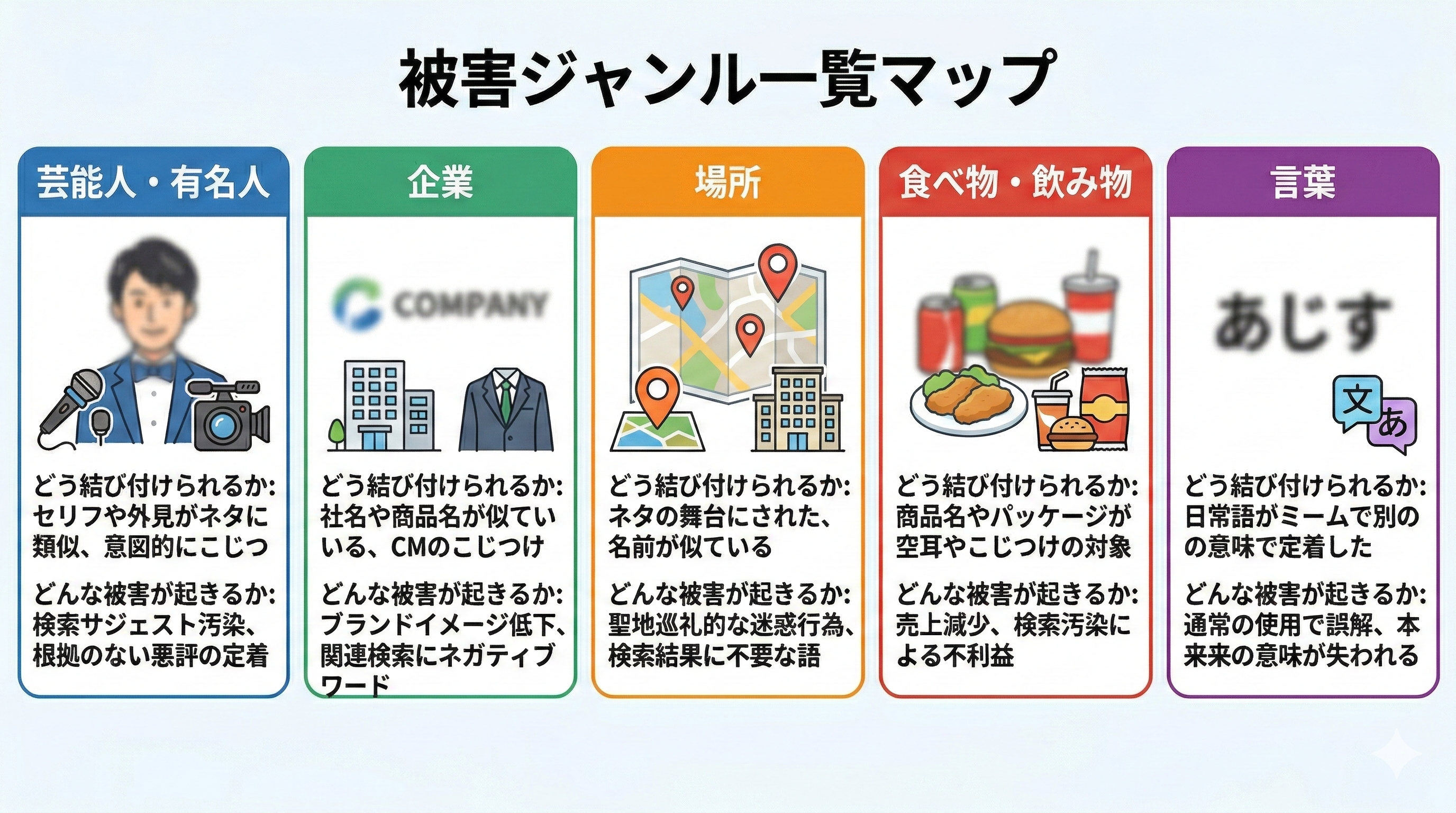 ここでは、その被害事例を「芸能人・有名人」「企業」「場所」「食べ物・飲み物」「言葉」という5つのジャンルに分けて具体的に紹介します。