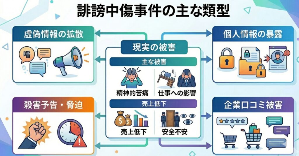 - 被害の形は、虚偽情報、個人情報暴露、脅迫、口コミ被害まで幅広い