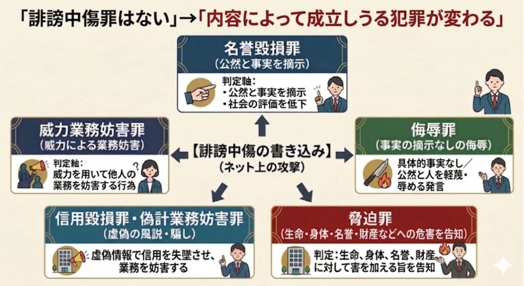 - 誹謗中傷は一つの罪名ではなく、内容で整理するテーマ