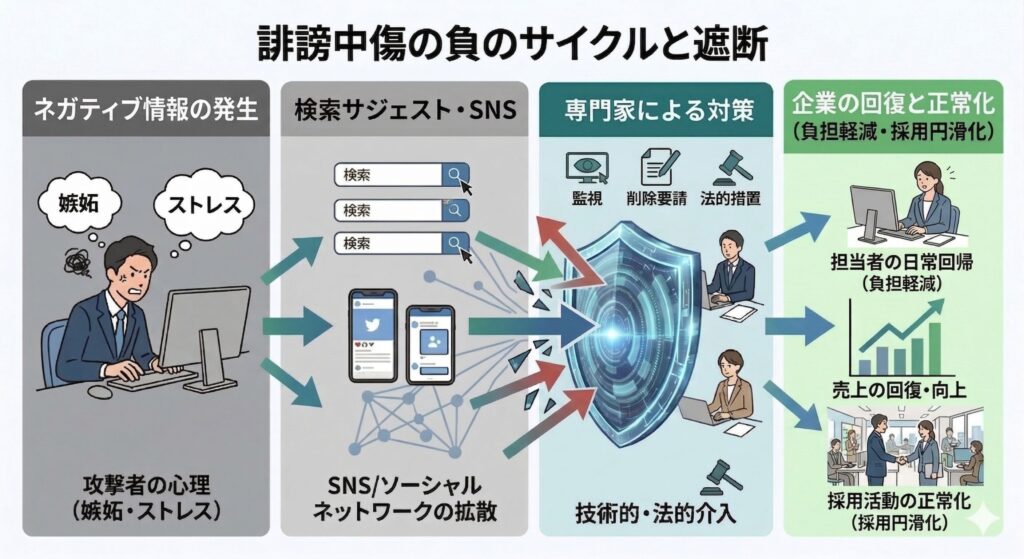 - 誹謗中傷の放置は、見えない場所で新規顧客や優秀な人材を失い続ける深刻な経営リスク