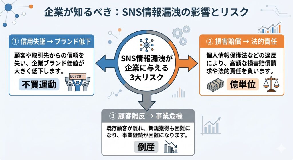 機密情報や顧客データがSNSに流出すると、ステークホルダーからの信頼は一瞬にして崩れ去ります。