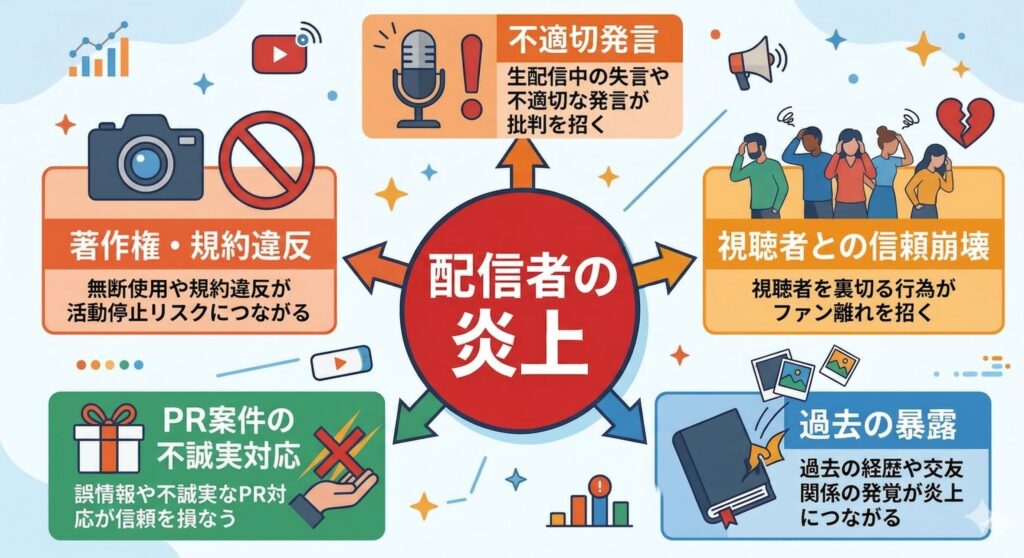- 配信者の炎上は、発言、案件、規約違反、私生活まで広く起こる