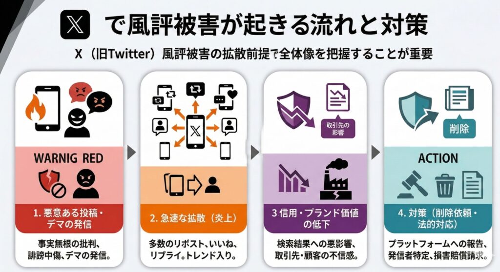 X(旧Twitter)での風評被害は、個人や企業の信用に深刻なダメージを与える問題です。