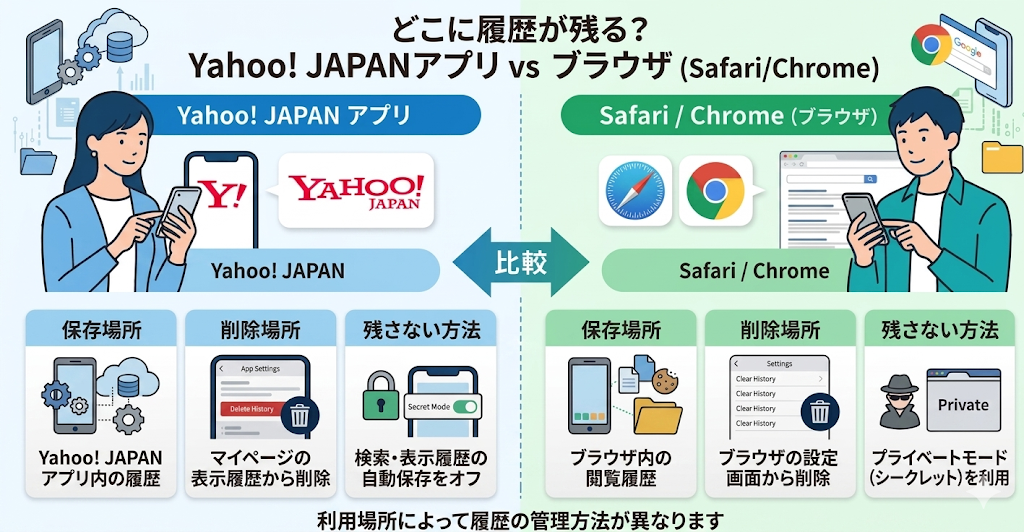 Yahoo!の利用には「Yahoo!JAPANアプリ」を使う場合と、SafariやChromeなどの「ブラウザ」を使う場合の2パターンがあり、それぞれ履歴の保存場所や削除方法が異なります。