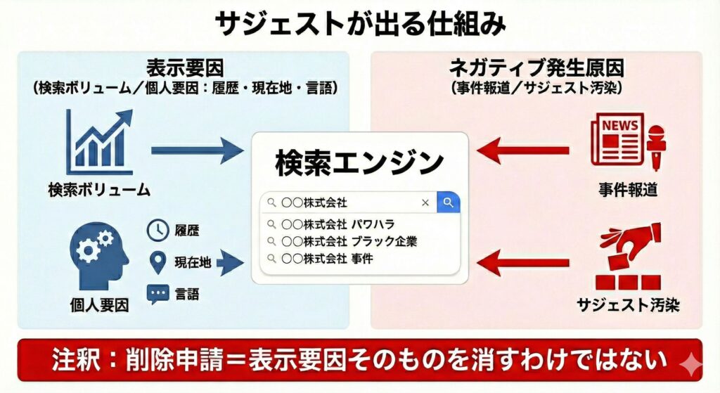 ネガティブなサジェストが表示される原因は、大きく分けて2つ考えられます。