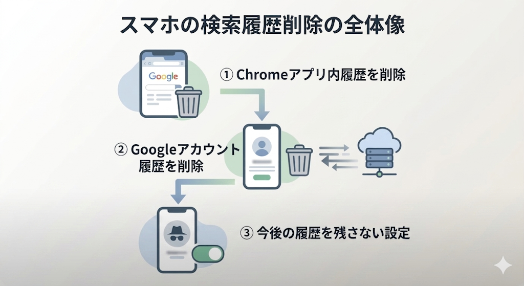スマホの検索履歴はChromeブラウザとGoogleアカウントの2箇所に保存されるため、両方を削除することが重要です。