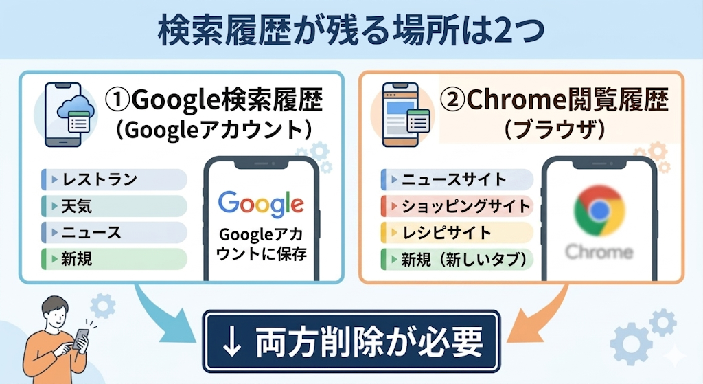 検索履歴はGoogleアカウントに保存され、閲覧履歴はブラウザ内に保存されるため、どちらか一方のみ削除しても完全には履歴を消去できない場合があります。