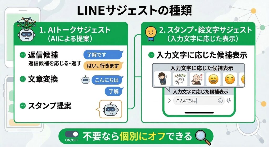 LINEのサジェスト機能は、「AIトークサジェスト」と「スタンプ・絵文字のサジェスト」で設定場所が異なります。