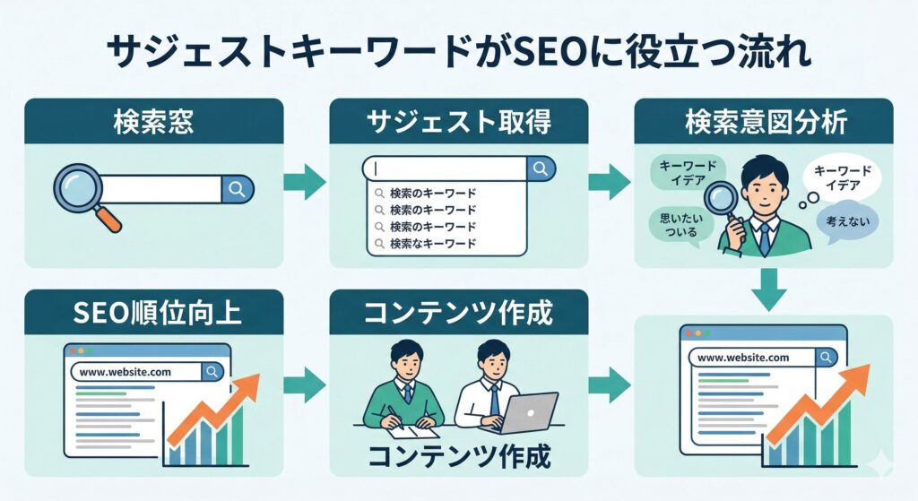 サジェストキーワードは、ユーザーが特定のキーワードに続けて入力する可能性が高い語句の組み合わせです。