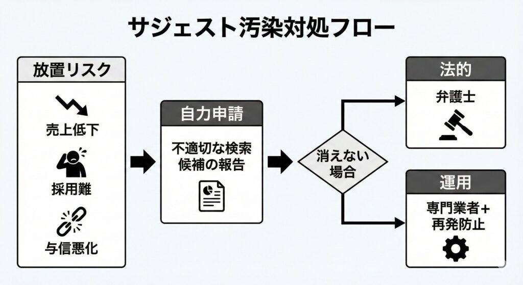 Googleなどに表示されるネガティブなサジェストは、自社の評判や事業活動に影響を及ぼす前に、迅速な対応が求められます。
