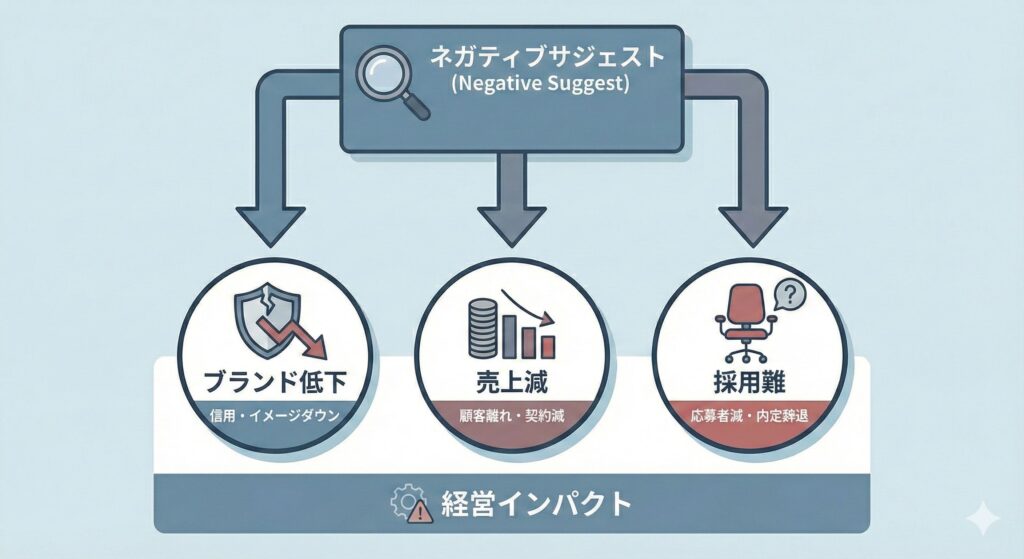 検索時に表示されるネガティブなサジェストは、企業のブランドイメージ、売上、採用活動に深刻なダメージを与える経営リスクです。
